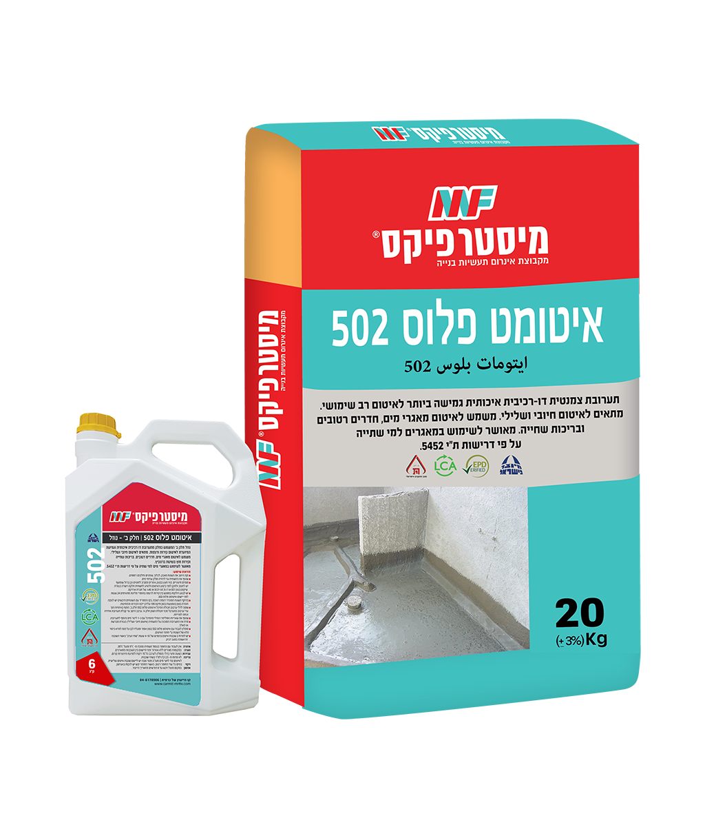 איטומט פלוס 502 מיסטר פיקס - תערובת צמנטית דו-רכיבית איכותית גמישה ביותר לאיטום רב שימושי, המיועדת לאיטום חדרים "רטובים", מאגרי מים ובריכות שחייה. כ-20 ק"ג.