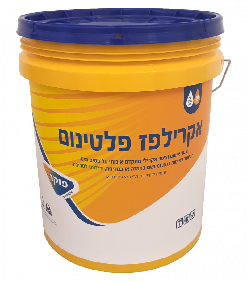 אקרילפז פלטינום פזקר - חומר איטום וציפוי אקרילי מתקדם על בסיס מים המיועד לאיטום והלבנת גגות ומיושם בהתזה או במריחה. כ-20 ק"ג.