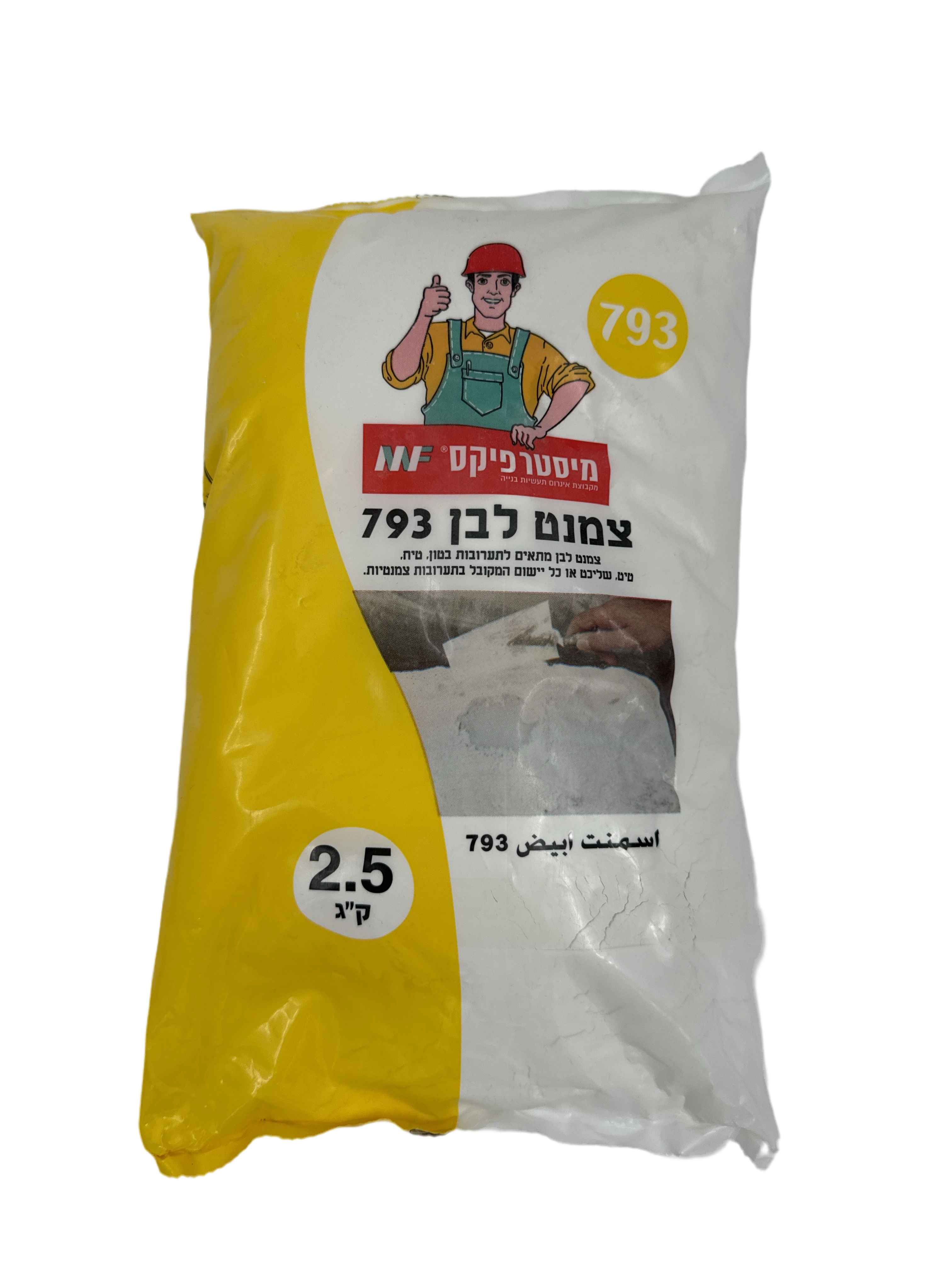 מלט לבן מיסטר פיקס 793 - משמש בעיקר להכנת תערובת ליציקות בטון כתוספת לתערובות טיט, חול, סומסום, חצץ, ריצוף, שליכט, כוחלה ועוד. כ-2.5 ק"ג.