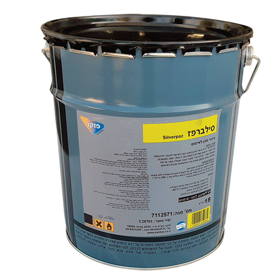 סילברפז ציפוי מגן פזקר - ציפוי מגן בצבע כסף על בסיס ביטומני בעל רפלקטיביות גבוהה המיועד להגנה ולהכספה של חומרי איטום עשויים ביטומן כמו יריעות ביטומניות, זפת, מסטיקים, משחות ועוד. כ-18 ק"ג.